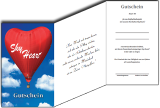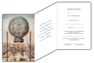 Wenn Sie es wünschen, bekommen Sie mit dem Geschenkgutschein gegen einen geringen Aufpreis in Höhe von 5,00 € zwei Picollo-Sektflaschen oder von 15,- € einen Miniballon mit Keramikkorb oder eine DVD "Ballonfahren-Einsteigen-Abheben-Geniessen" mit 20€ Wertgutschein für 10 €. ( zzgl. Versandkosten)